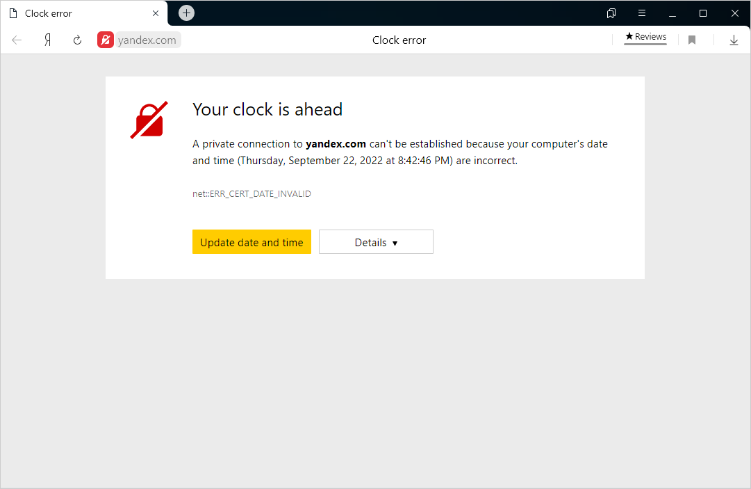 If time settings are not accurate on your computer, Yandex Browser can't determine if the site's certificate is current or not. This is why, when opening the site, you will see the message “Your clock is ahead” or “Your clock is behind”.