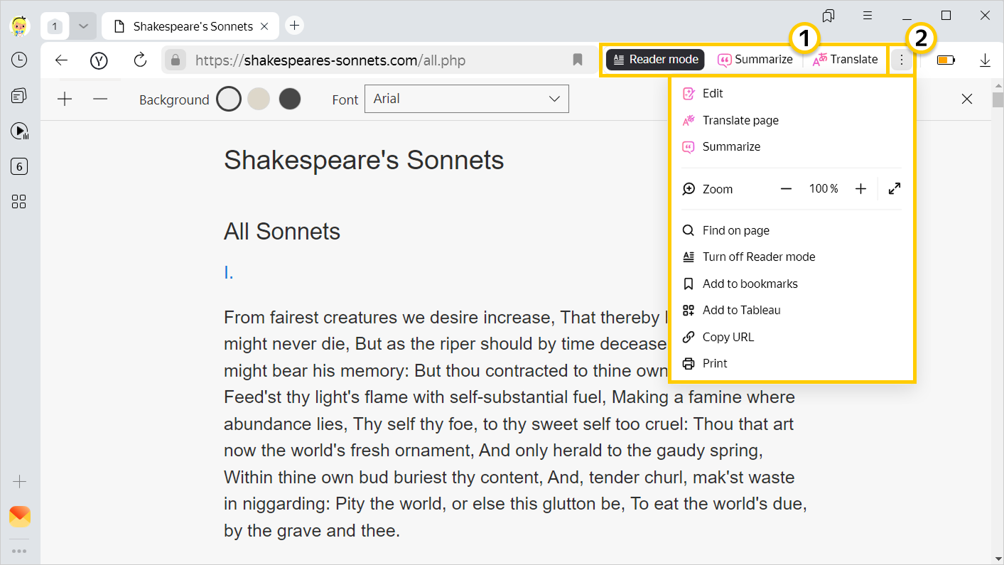 To summarize the page, translate it, or perform another action, click the associated button. You can activate several actions at once, such as Reader mode and summary.