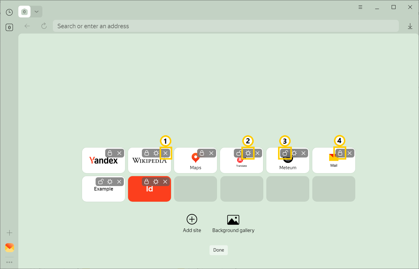 You can group tiles into folders. For example, tiles that link to Yandex services are grouped into a single folder by default.