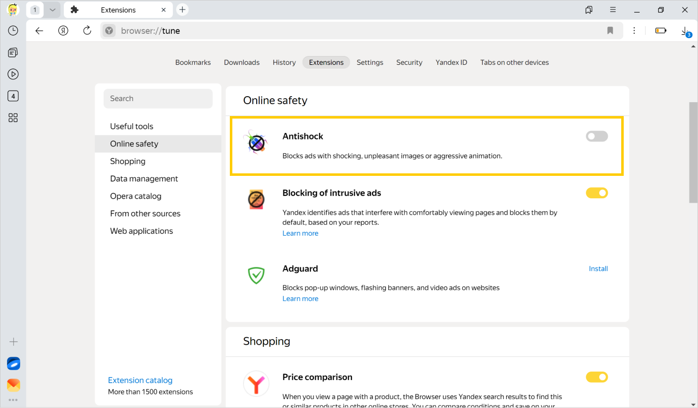 Antishock is an extension for Yandex Browser that filters out banners containing unpleasant images, pornography, and ads for sites that may offer fraudulent services.