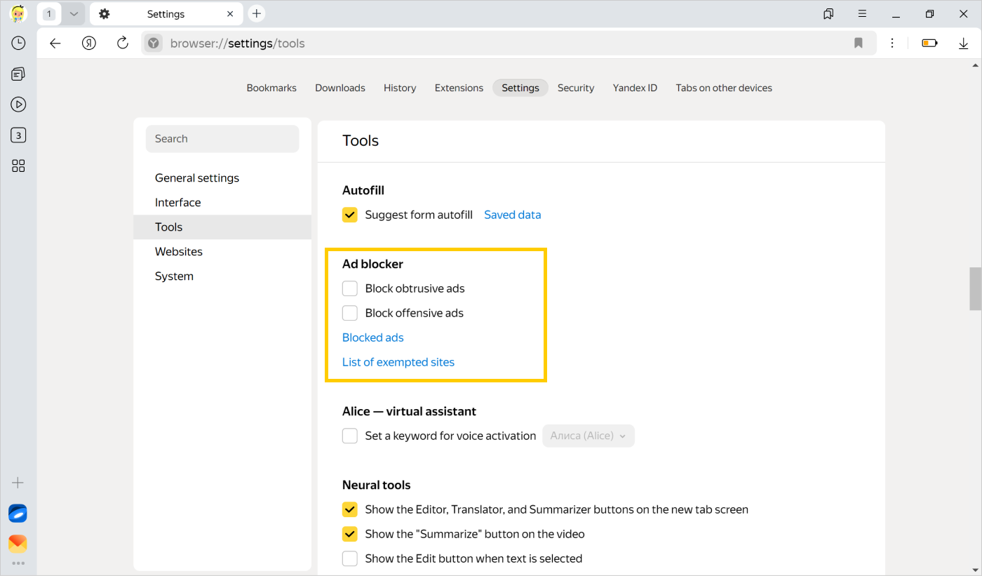 2. Go to the Ad blocker section and disable the Block offensive ads option.