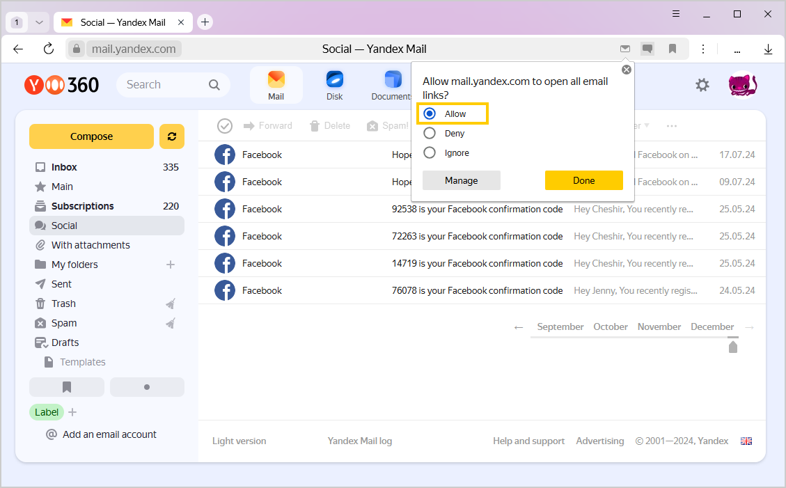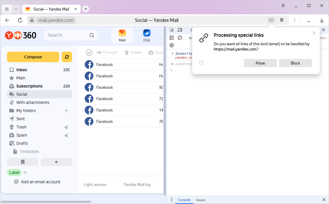 When you open Yandex Mail in Yandex Browser for the first time, it offers to make it your default protocol handler: