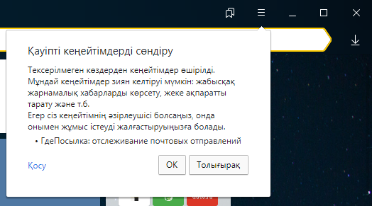 Егер дереккөзге толық сенімді болсаңыз ғана, кеңейтімді қосыңыз. Бұл зиянды болуы мүмкін. Браузер зиянды кеңейтулерді бұғаттайды, бірақ егер әлі қара тізімге түспесе, деректеріңіз қатер астында болады. Толығырақ Зарарлы кеңейтімдер несімен қауіпті  бөлімін қараңыз.