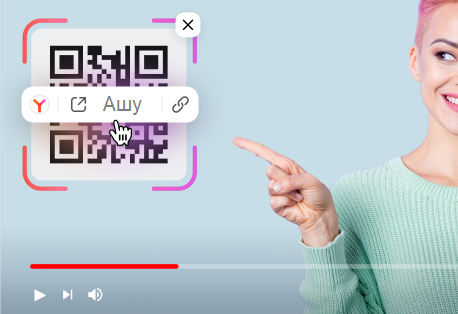 Яндекс Браузер видеодағы QR-кодтарды ажыратып, олардың мазмұнын көрсете алады. QR-кодта түрлі-түсті жиектеме мен сілтеме арқылы өту немесе көшіріп алуға арналған батырмалар пайда болады.