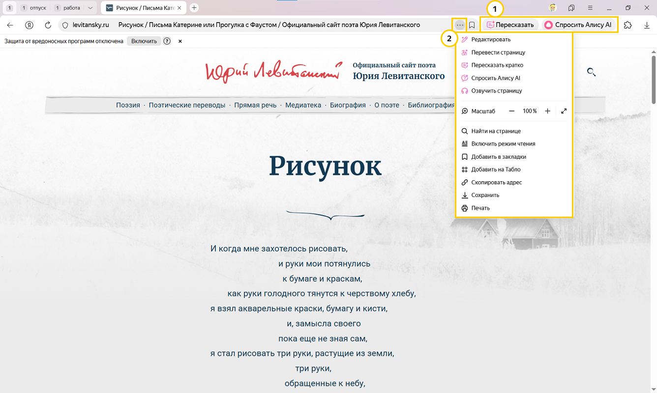 Открыть меню страницы. Нажмите, чтобы увидеть список всех действий со страницей. Например: озвучить или перевести страницу, добавить ее в закладки или на Табло. Не отключается.