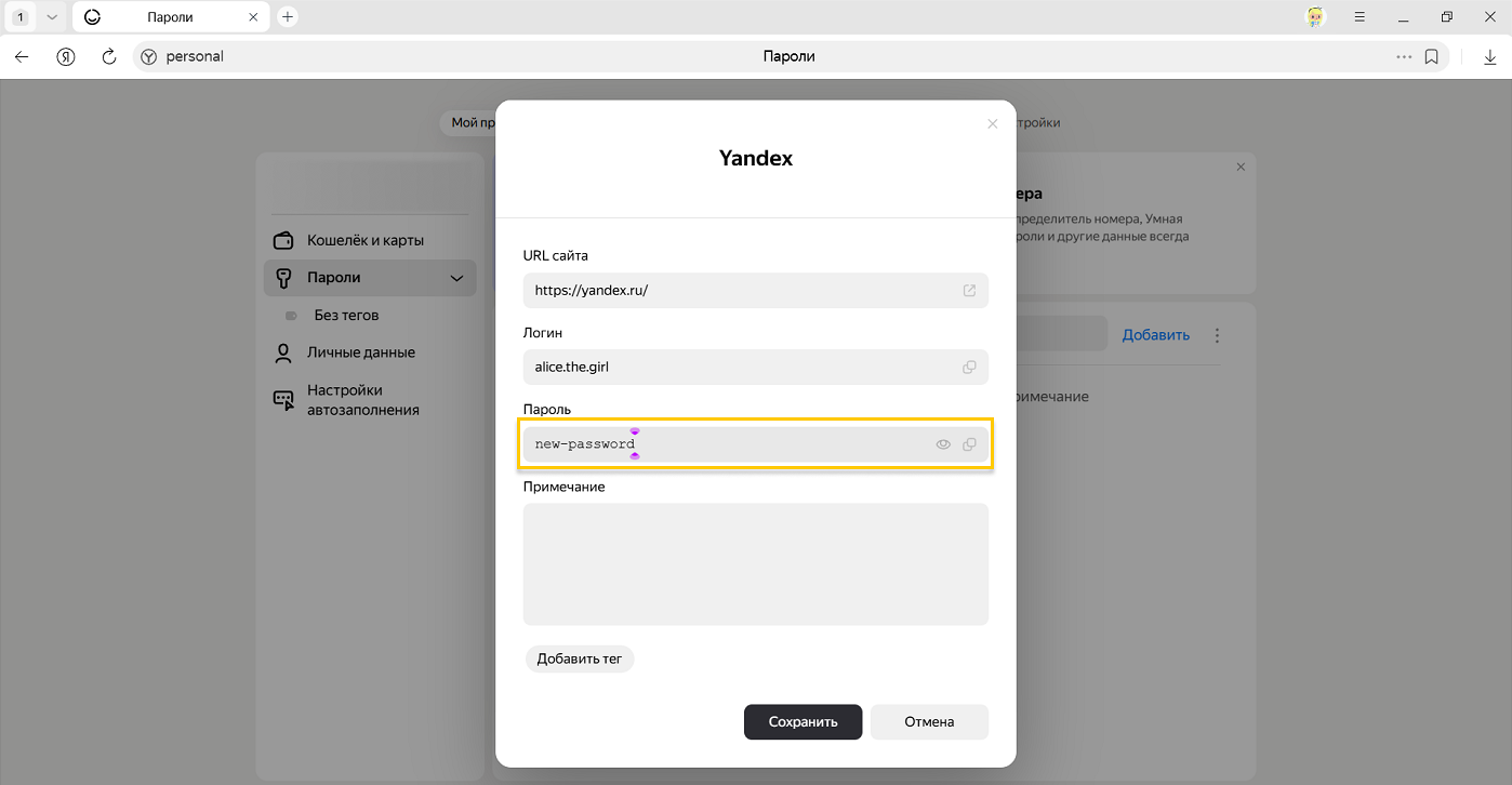 Аналогичным образом можно сохранить в менеджере паролей СНИЛС, номер паспорта и другую конфиденциальную информацию. Если у вас включено сохранение карт, то данные будут доступны со всех ваших устройств. За безопасность данных можно не беспокоиться — они хранятся в зашифрованном виде. Подробнее см. статью «Как зашифровать любую важную информацию в Браузере».
