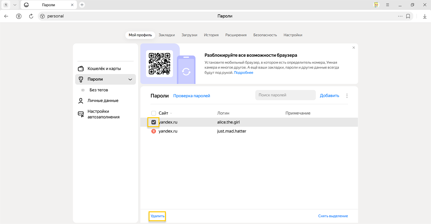 Если вы удалили пароль по ошибке, то сразу можете его вернуть. В левом нижнем углу менеджера паролей нажмите Восстановить. Если вы перезагрузите страницу или перейдете на другую вкладку, то не сможете вернуть пароль.