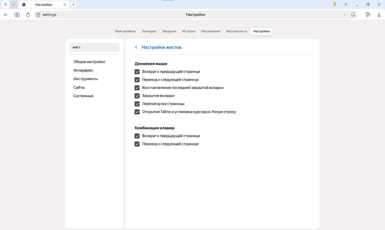 По умолчанию поддержка жестов мыши в настройках Яндекс Браузера отключена. Чтобы использовать жесты мыши: