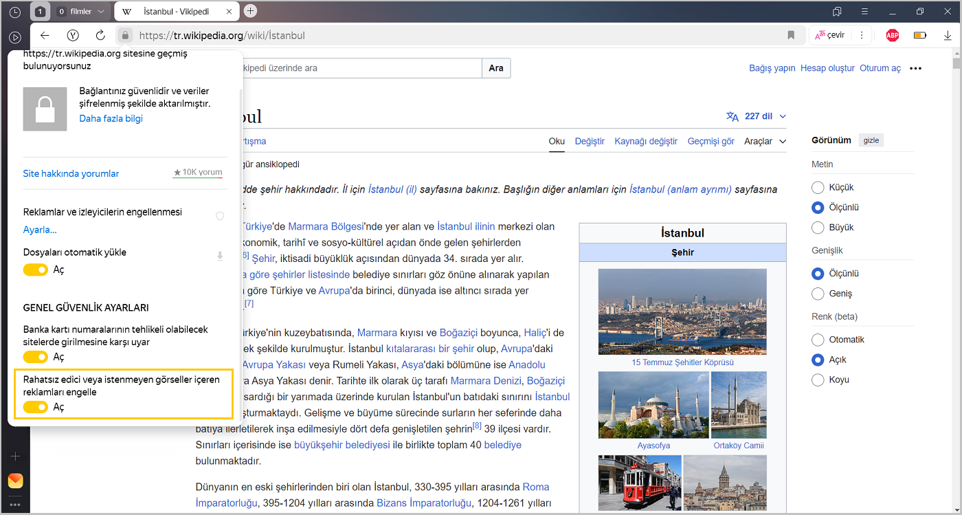- Genel güvenlik ayarları bloğunda Rahatsız edici veya istenmeyen görseller içeren reklamları engelle seçeneğini çalıştırın veya devre dışı bırakın.