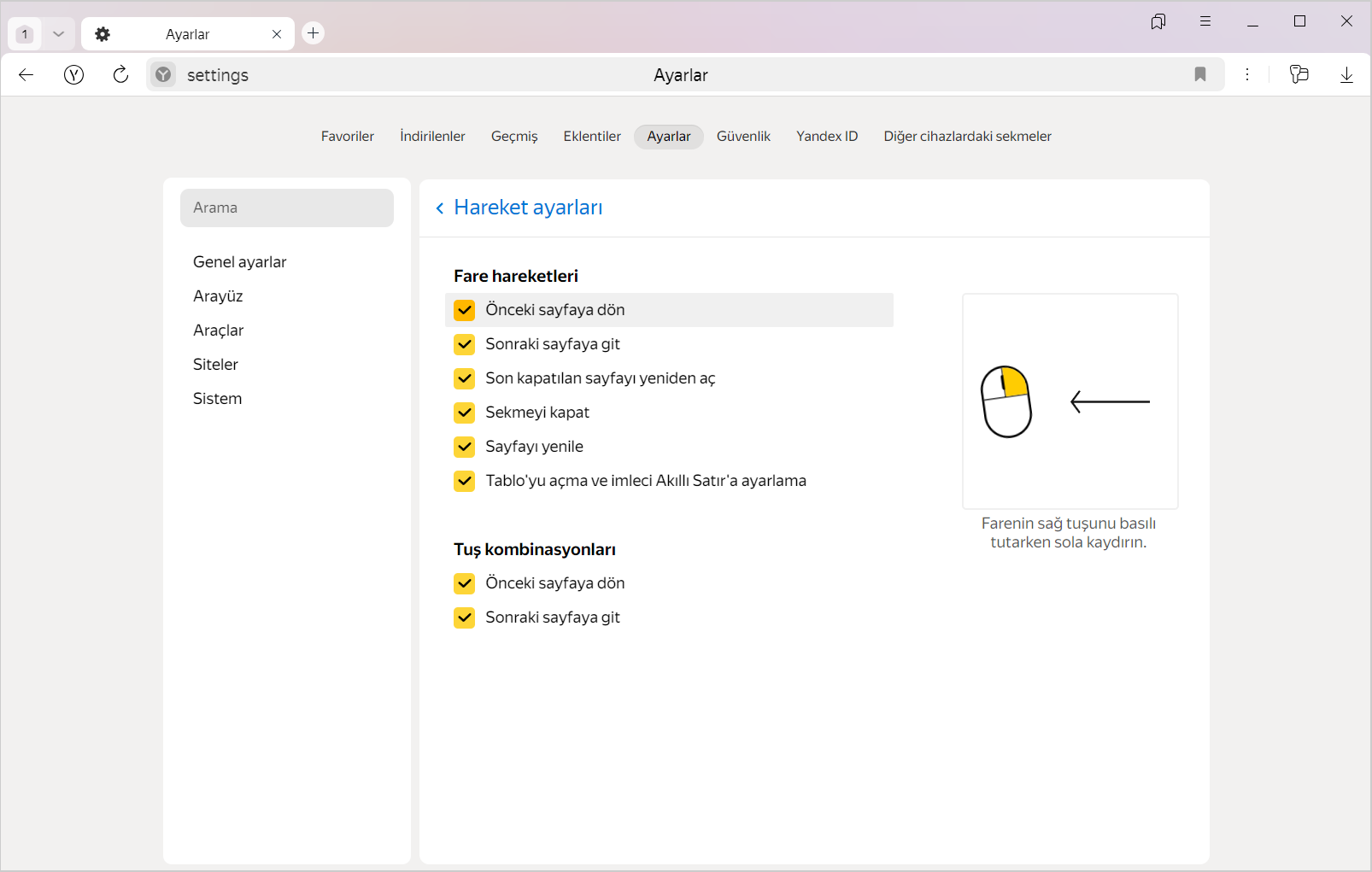 Yandex Browser ayarlarında fare hareketleri desteği varsayılan olarak devre dışıdır. Fare hareketlerini kullanmak için:
