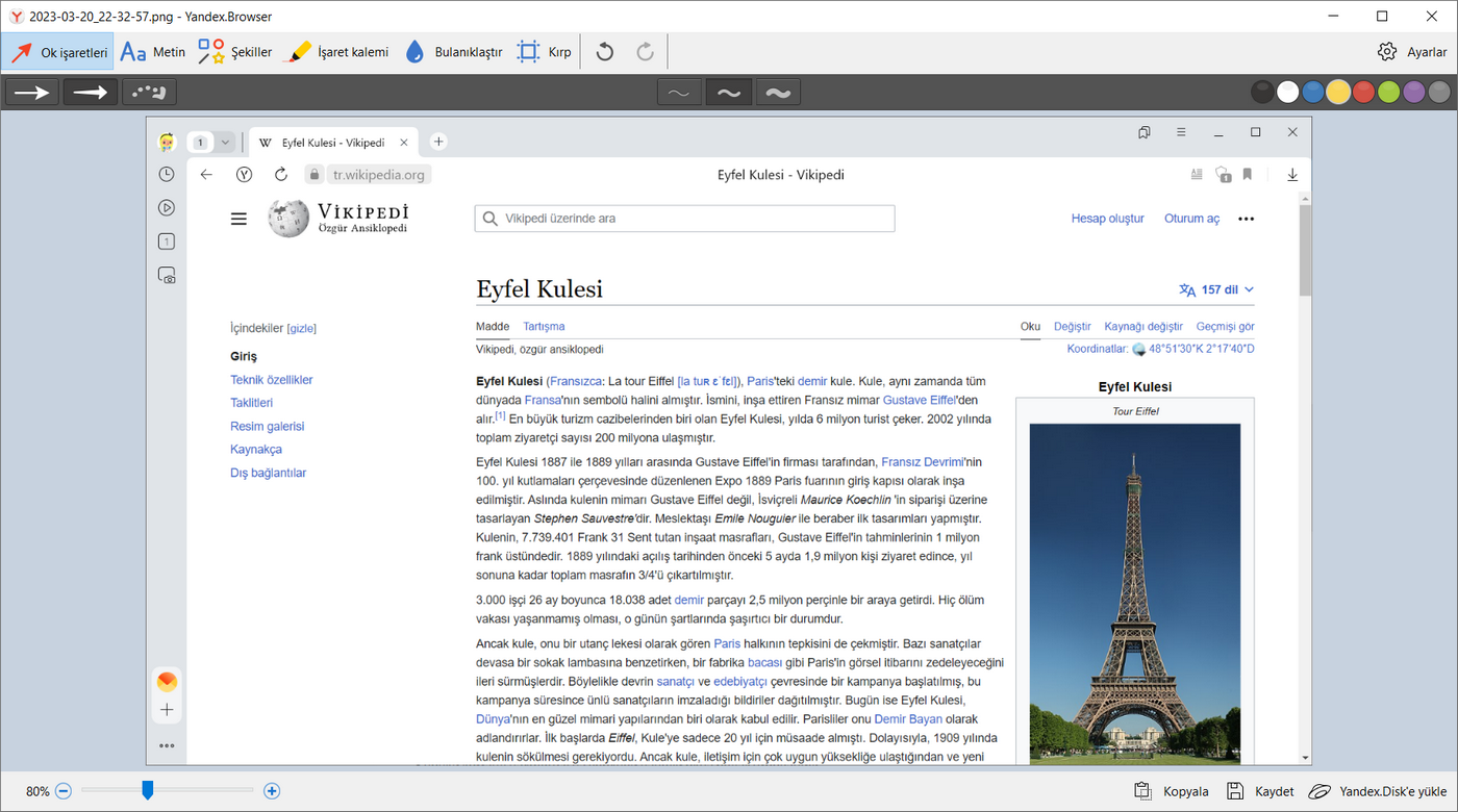 Yandex Browser'da ekranın seçtiğiniz kısmının veya tüm ekranın ekran görüntülerini alabilir, görseli düzenleyin ve bu görsele oklar ve yazılar ekleyebilirsiniz. Ekran görüntüsünü arkadaşlarınıza veya Destek Ekibi'ne gönderebilirsiniz.