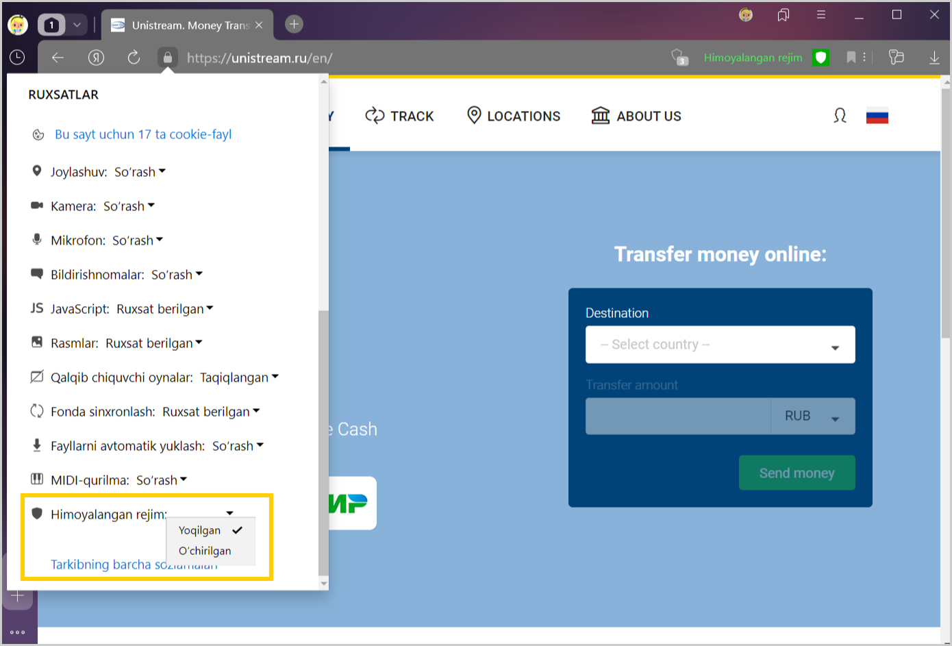 Agar siz onlayn to‘lov sahifasini ochsangiz va interfeys o‘zgarishini ko‘rmasangiz, himoyalangan rejimni majburiy ravishda yoqing.