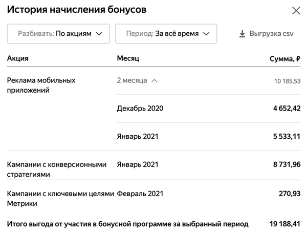 The amount of bonuses earned during the previous period, including all offers. The statistics are updated before the 10th calendar day of each month. To activate bonuses and start using them to pay for your advertising campaigns, top up your account before the specified date.