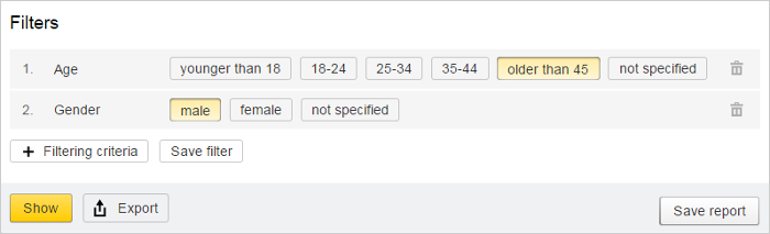 For example, you want to know which campaigns received the most clicks from men aged over 45. First, in Cross sections, choose Campaigns. In Columns, choose Impressions and Clicks. Then add the Age and Gender filters: