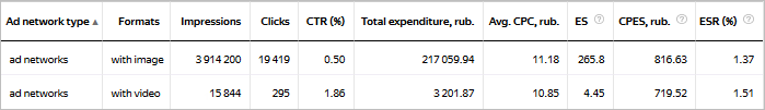 To find out what ad formats, audiences, sites, and display regions result in the most converted sessions, compare relative indicators — Cost per ES to ES rate (%) in various cross sections.