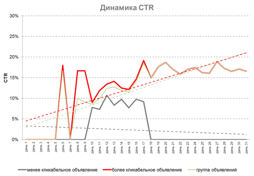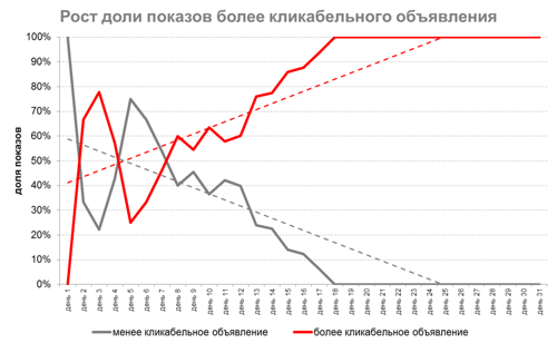 Вот пример изменения CTR и доли показов у двух объявлений в группе, которая в течение календарного месяца попадала в премиум-показы. На графиках видно, как более кликабельное объявление постепенно начинает показываться чаще, а вместе с этим растет общий CTR группы.