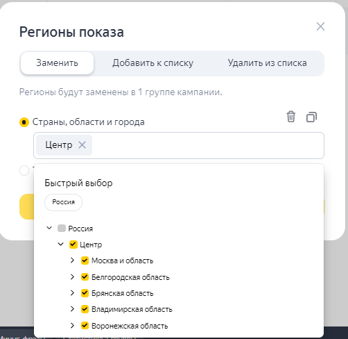 Заменить — выбранные регионы заменят текущие. Можно заменить показы в области или городе на показы в указанном регионе на карте.