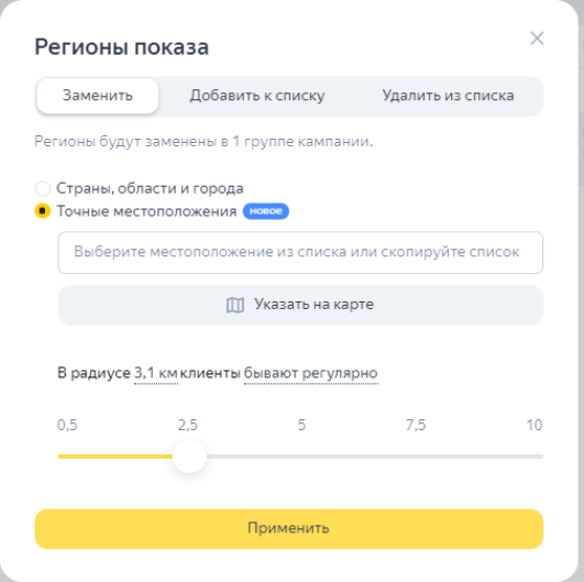 • Заменить — выбранные регионы заменят текущие. Можно заменить показы в области или городе на показы в указанном регионе на карте.