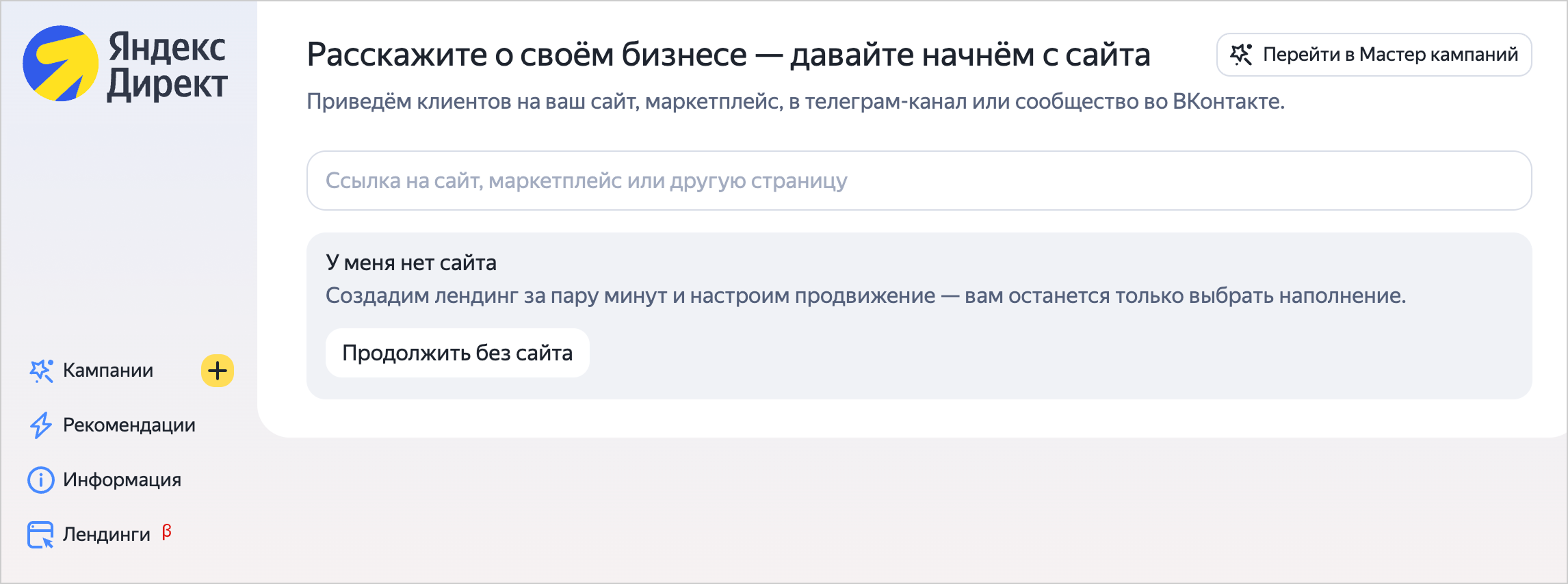 В Мастере кампаний создайте кампанию, в настройках нажмите на поле для ввода сайта и выберите Создать лендинг.