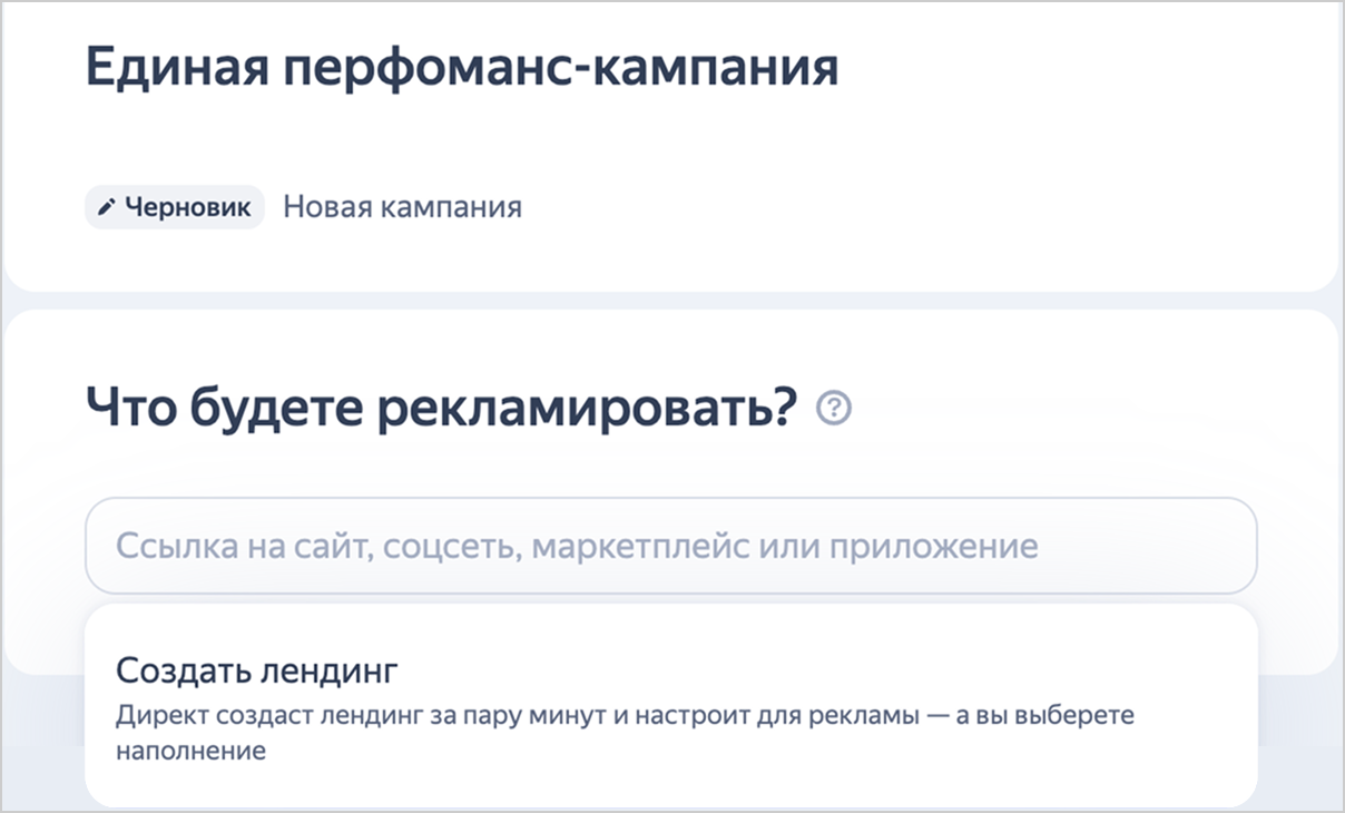 - в Единой перфоманс-кампании — для текстово-графических объявлений можно создать новый лендинг или выбрать существующий;