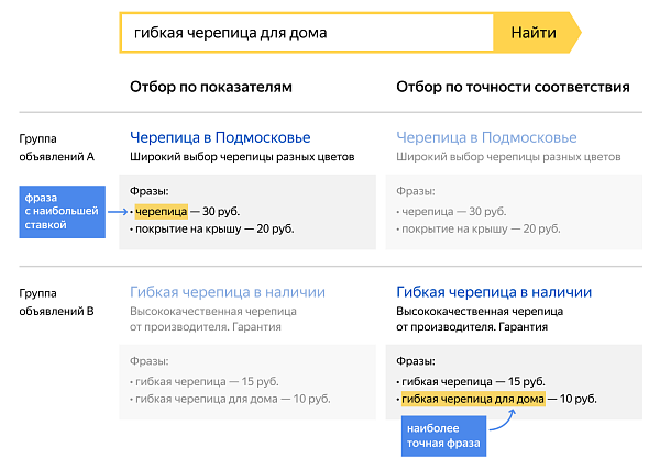 В ответ на поисковый запрос гибкая черепица для дома при настройках по умолчанию будет выбрана фраза из первой группы с более высокой ставкой. Если вы включите выбор по точности соответствия фразе, покажется объявление из второй группы, так как указанная к этому объявлению фраза более точно отвечает на запрос пользователя.