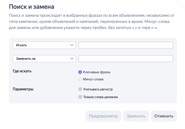 Инструмент поиска и замены позволяет быстро внести исправления сразу в несколько ключевых фраз в разных кампаниях и группах, например, исправить опечатку.