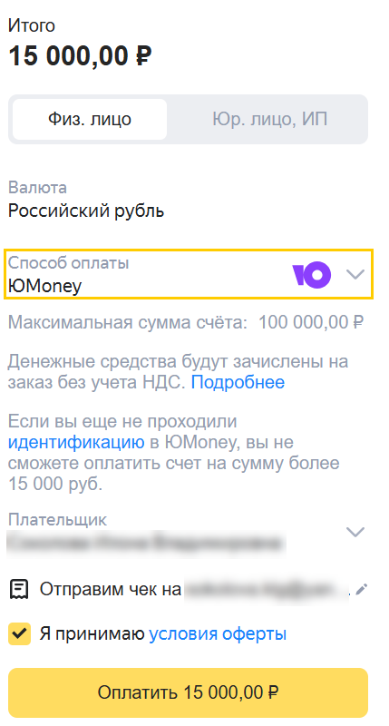 С помощью ЮMoney можно оплатить выставленный счет на сумму не более 100 000 руб. Если сумма платежа больше 15 000 руб., необходимо, чтобы счет в ЮMoney был идентифицированным.