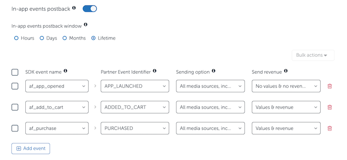 Нажмите Add Event и добавьте af_app_opened, чтобы включить передачу сессий.