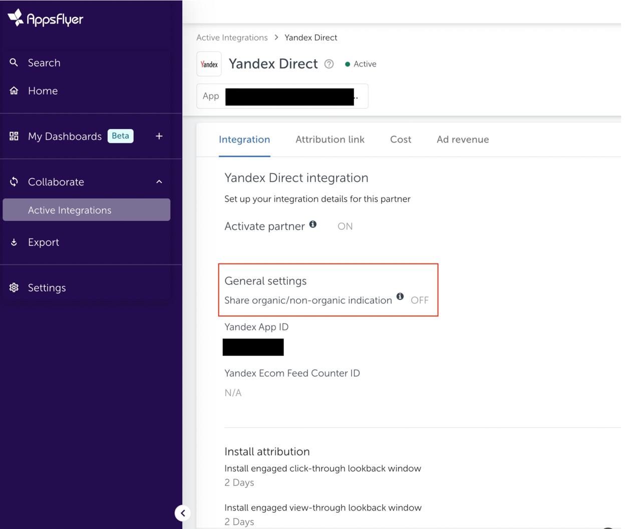 Для передачи статуса перейдите в раздел Active integrations, выберите Yandex Direct и в блоке General settings включите опцию Share organic/non-organic indication.