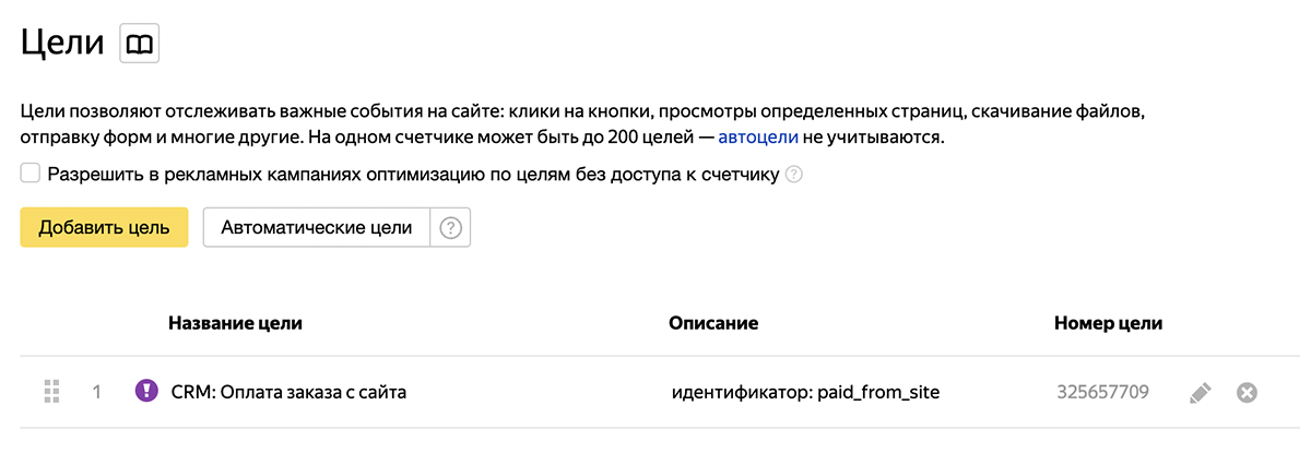 Если в качестве статусов заказа вы используете фиксированный набор статусов (например, IN_PROGRESS или PAID), то после первой выгрузки в течение 24 часов зайдите в Метрику и проверьте, что в Конверсиях появились 2 новые цели: