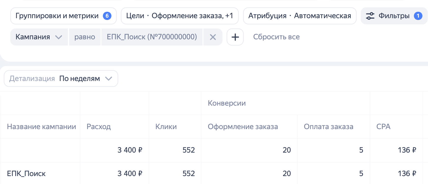 Например, в кампании получено 20 конверсий по цели «Оформление заказа», средняя цена конверсии 100 рублей, и 5 конверсий по цели «Оплата заказа» со средней ценой конверсии 300 рублей.