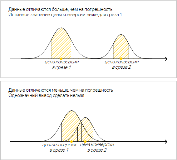 Сравнивая статистику по двум срезам, учитывайте статистическую погрешность — возможное отклонение полученных данных от истинного значения. Если данные отличаются меньше, чем на погрешность, то нельзя делать вывод, что в одном срезе результаты оказались лучше, чем в другом.