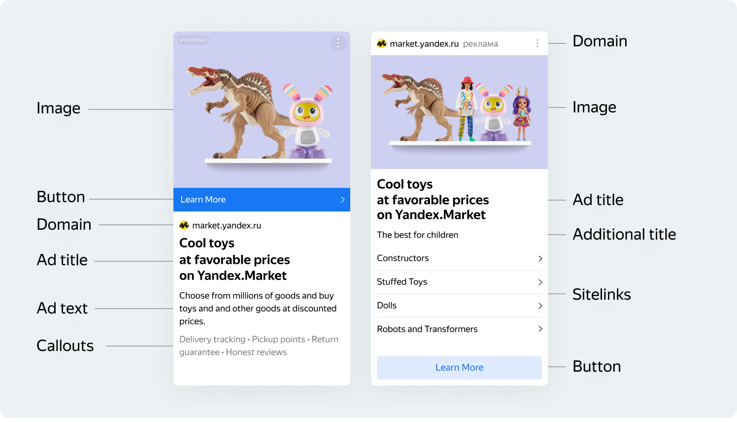 Yandex Reklam Ağı’nda, her gösterim için farklı eklemelerle otomatik olarak reklamlar toplayan, makine öğrenimi tabanlı bir teknoloji olan Smart Design çalışır.