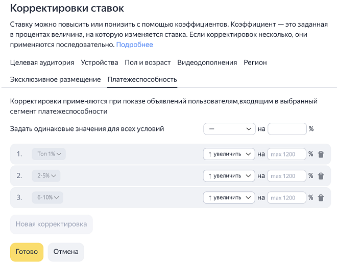 Teklif, dönüşüm fiyatı veya dönüşüm değeri düzenlemelerini ödeme gücü yüksek kullanıcı segmenti için özel olarak ayarlayabilirsiniz. Kullanıcı davranışlarını farklı parametrelere göre analiz eden sistem, analiz sonuçlarına göre kullanıcıları ödeme güçlerine göre farklı segmentlere ayırır. Düzenlemeler sayesinde 3 gruba bölünmüş Yandex kullanıcı kitlesinin %10’u için gösterimler için teklifinizi, dönüşüm fiyatınızı veya reklam giderlerinin payını yükseltebilir veya düşürebilirsiniz: