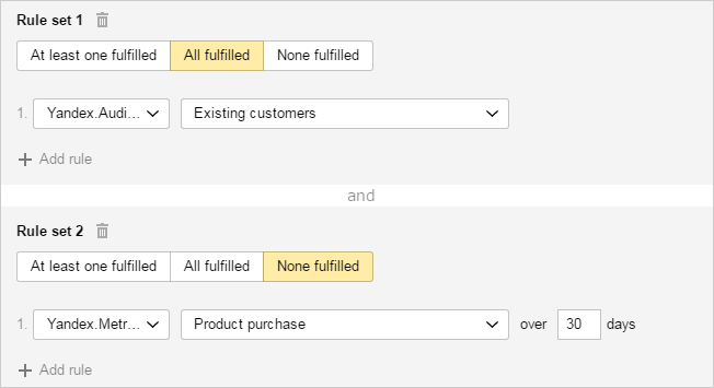根据 Yandex Audience 用户细分、Yandex Metrica 目标或 Yandex Metrica 用户细分创建规则(您可以使用任何包含 100 名或更多用户的自动或自定义用户细分)。
