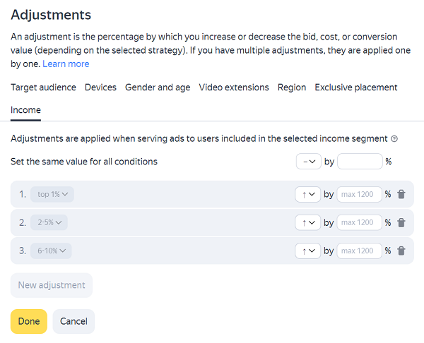 您可以为高收入受众群体设置出价、CPC 或 CPA 的调整。 系统会分析用户行为的不同参数,并将其分配到反映其收入水平的不同细分中。 这些调整功能允许您对10%的高收入Yandex受众群体(该群体被划分为三组)的展示量出价、CPC 或 CPA 进行增减: