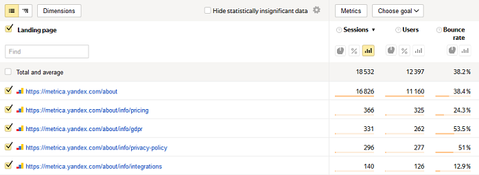 The report contains statistics on the pages user sessions start from. The report only contains data on sessions that started from the pages specified there.