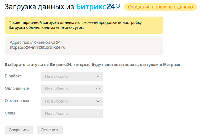 To start receiving orders from Bitrix24 in Yandex Metrica, specify how statuses in your CRM correspond to status types in Yandex Metrica. To do this, go to Upload data from Bitrix24 (Integrations → Transferring orders from CRM → Deals and customers from Bitrix24):