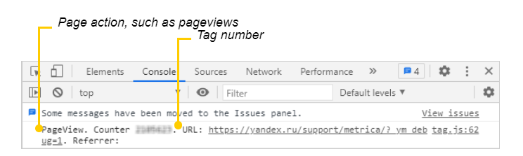 If the console displays information about the tag number and the action on the page (for example, PageView), then the tag is working correctly. See what other events may be displayed in the browser console.