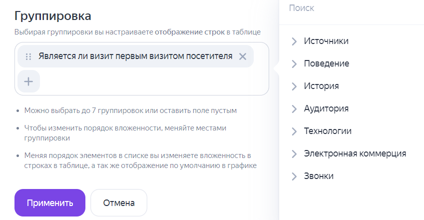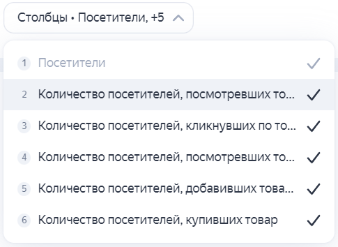Using the Dimensions field, you can select up to 7 necessary dimension or leave the field empty. By choosing dimensions and changing their order in the list, you can customize the display of rows in the table: change the nesting of elements in the rows and the default display on the chart.