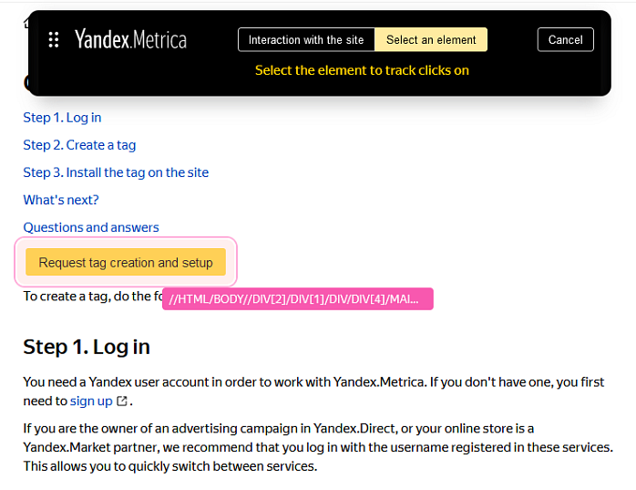 To locate elements on the page, Yandex Metrica uses the ID attribute or the content of the element, as well as XPATH, which is a query language for searching nodes in an HTML document. If a clickable element is placed in the same location on multiple pages of your site, the goal will be achieved on multiple pages. For example, this applies to links in the navigation menu of your site.