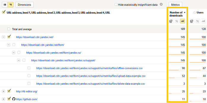 Los datos del informe se agrupan por la dirección en que se ubica el archivo para su descarga.