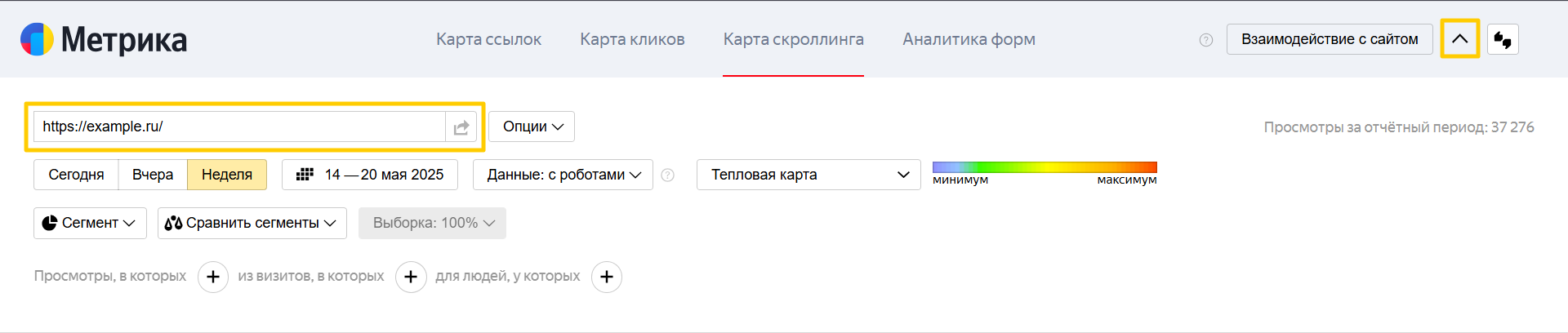 Карта будет отображена на наиболее популярной странице сайта, URL которой соответствует указанному условию. Числовые показатели (среднее время и количество просмотров) будут являться объединенными для всех страниц, соответствующих условию.