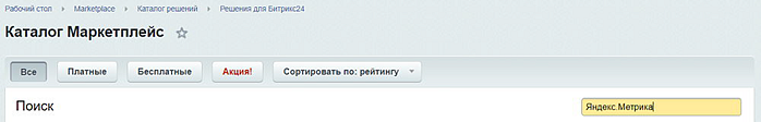 - Перейдите в 1С-Битрикс: Маркетплейс, найдите модуль с названием «Яндекс Метрика».