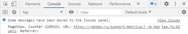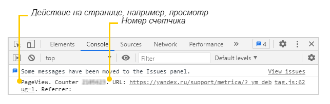Информацию о действиях на сайте, например просмотре (PageView), можно увидеть на вкладке Console.