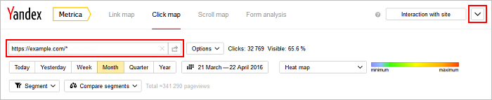 让我们看一个示例: 您需要获取 https://example.com/goods/ 目录中页面的统计。 为了使该数据显示在热图上,请在地址框中输入 https://example.com/goods/*(输入后,下拉建议中会显示相同的地址)。 数据将自动加载。