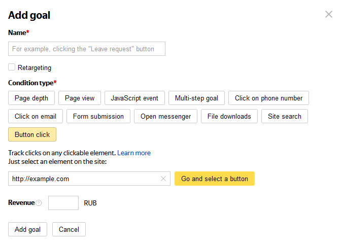您可以跟踪与您网站上各种按钮和链接的点击相关的目标。 创建此类目标时,Yandex Metrica 会保存有关这些元素的位置和属性的信息。