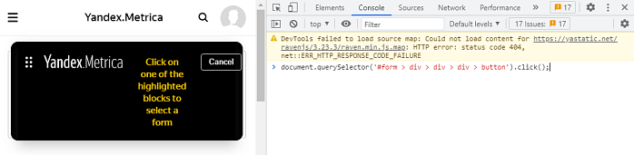 document.querySelector('xxxx').click();,其中xxxx是您复制的值。 如果一切都正确完成,所需的表单会在页面上突出显示。