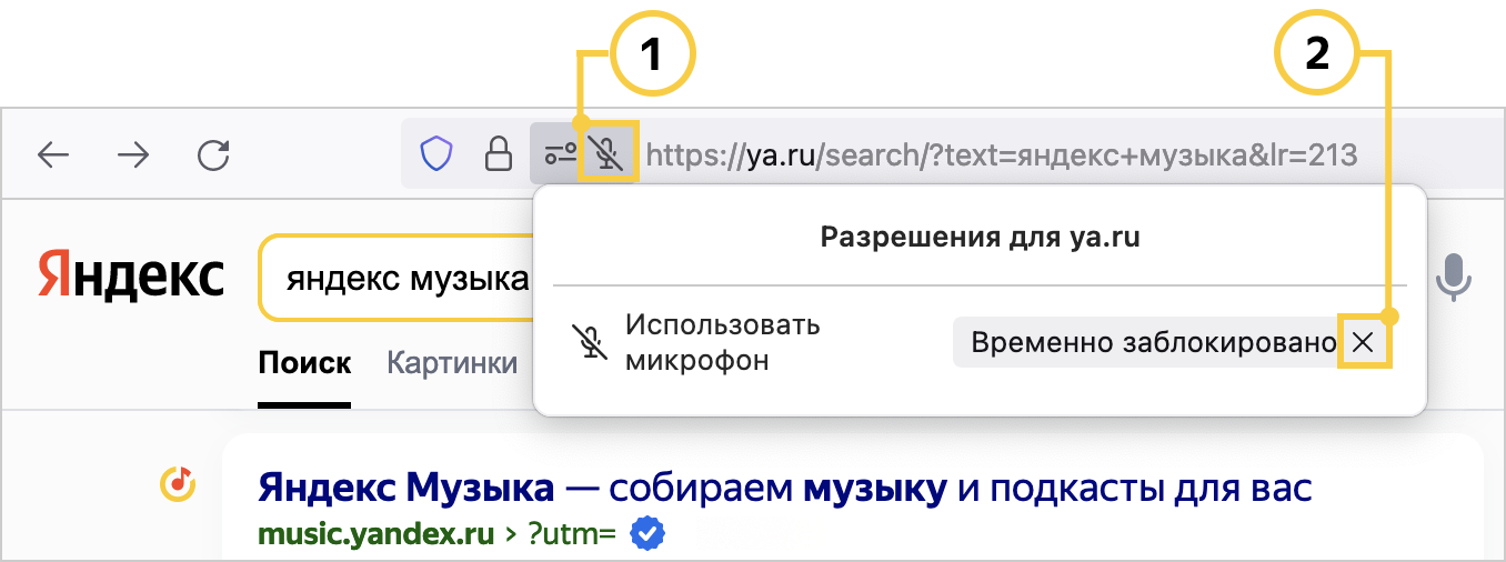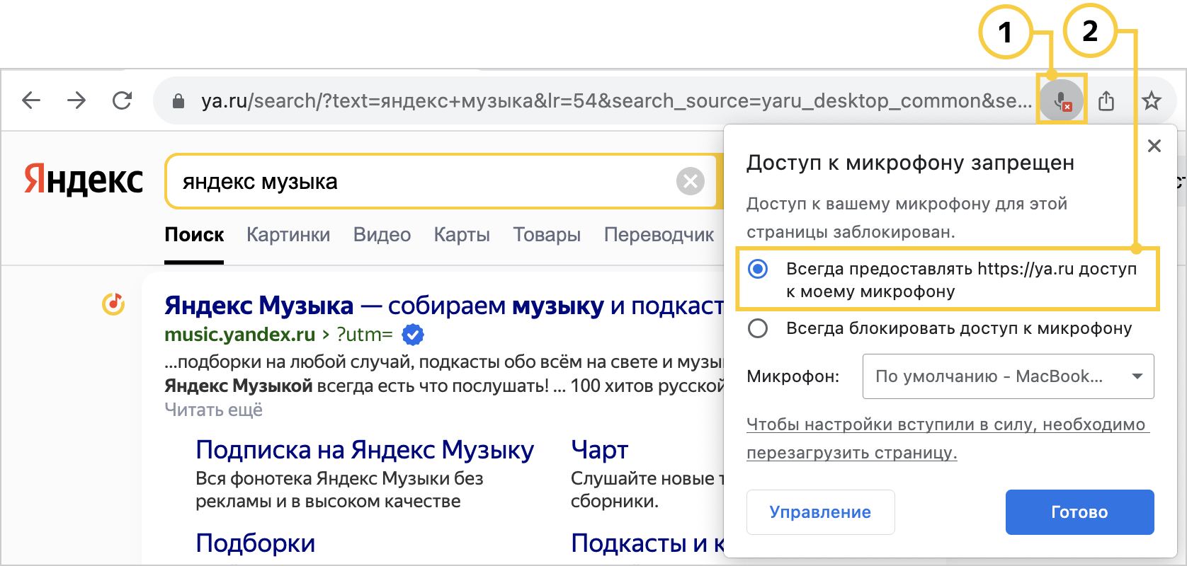 в правой части адресной строки. - Выберите опцию Всегда предоставлять https://ya.ru доступ к моему микрофону и нажмите кнопку Готово.