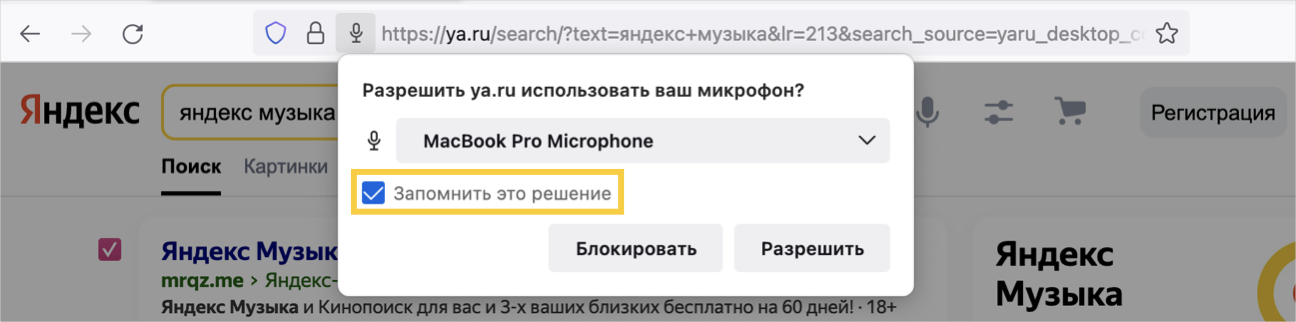 Если вы хотите, чтобы браузер запомнил ваш выбор и не запрашивал разрешение использовать микрофон при каждом включении голосового поиска, выберите опцию Запомнить это решение.